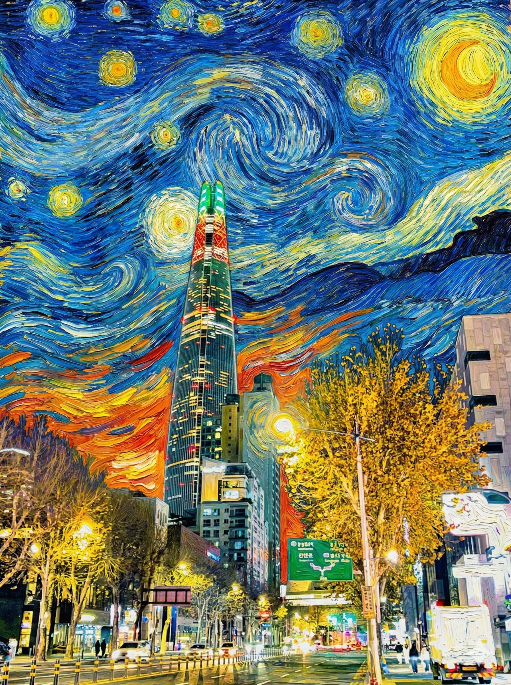 (프롬프트 예시) "이 사진 속 풍경을 빈센트 반 고흐의 유화 스타일로 다시 그려줘. 강렬하고 두꺼운 붓터치와 특유의 소용돌이치는 하늘의 느낌을 잘 살려줘."