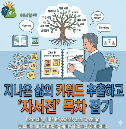 (프롬프트 예시) "나는 이제 내 인생을 정리하는 자서전을 써보려고 해. 내가 몇 가지 기억나는 사건들을 말해줄 테니, 여기서 내 인생을 관통하는 핵심 키워드 5개만 뽑아줄래? [사건: 가난했던 유년 시절의 만화방, 첫 직장에서의 실수와 야근, 아이를 처음 품에 안았던 날의 떨림, 명예퇴직 후 느꼈던 상실감, 최근 시작한 등산 모임에서의 즐거움]"